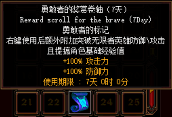 30分钟和7天勇敢者的奖赏卷轴之分别为:30分钟基础经验:12倍 7天基础经验:15倍